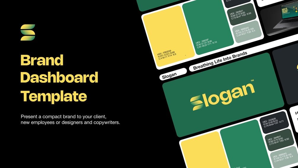 Present a compact brand to your client, new employees or designers and copywriters. The Brand Dashboard showcases your brand in a neat and clean way, plus it displays your brand in its simplest form. This template is ideal for making a brand understandable while still being substantial.